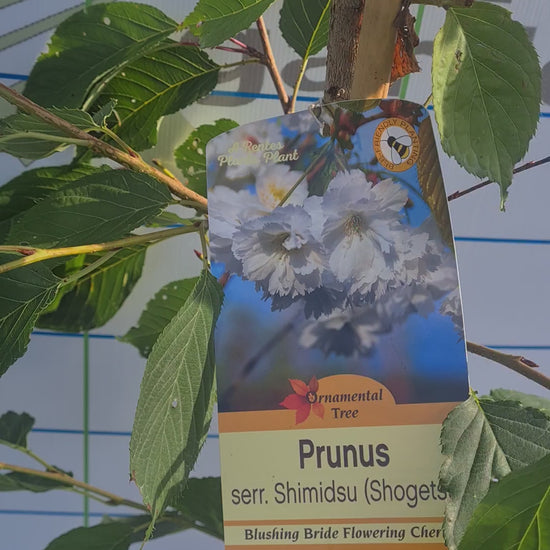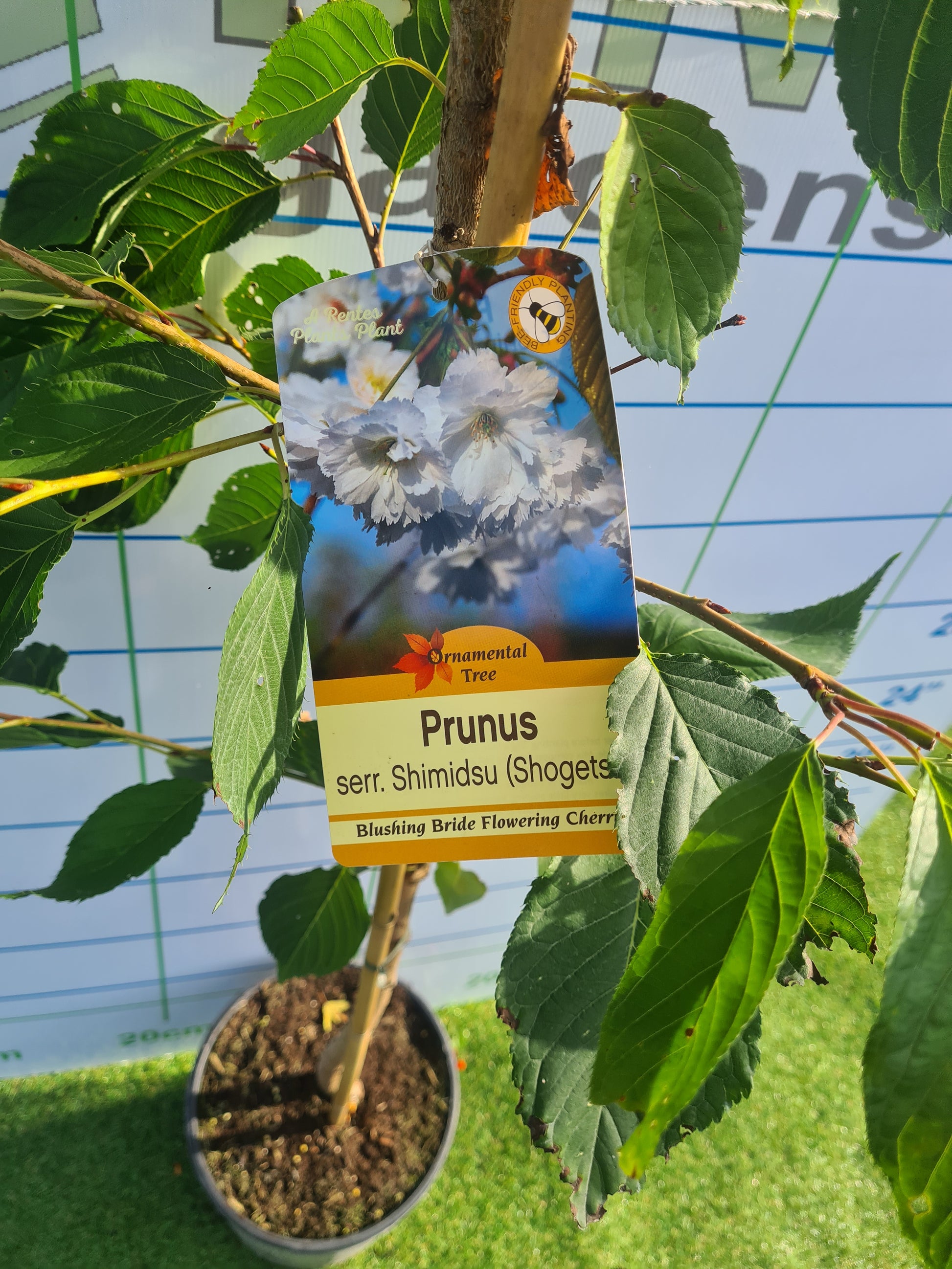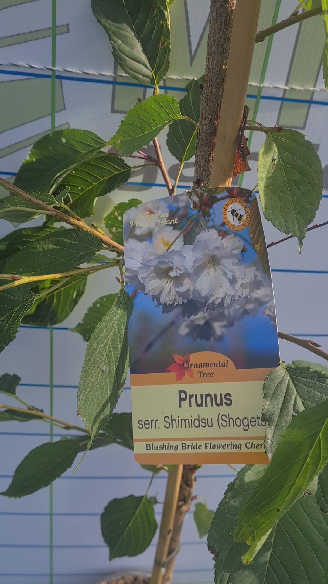 The Shimidsu Blushing Bride tree (botanically known as Prunus ‘Shogetsu’) is widely regarded as one of the most beautiful and elegant of the Japanese flowering cherry trees. It is prized for its late-season blooms and graceful, spreading habit.